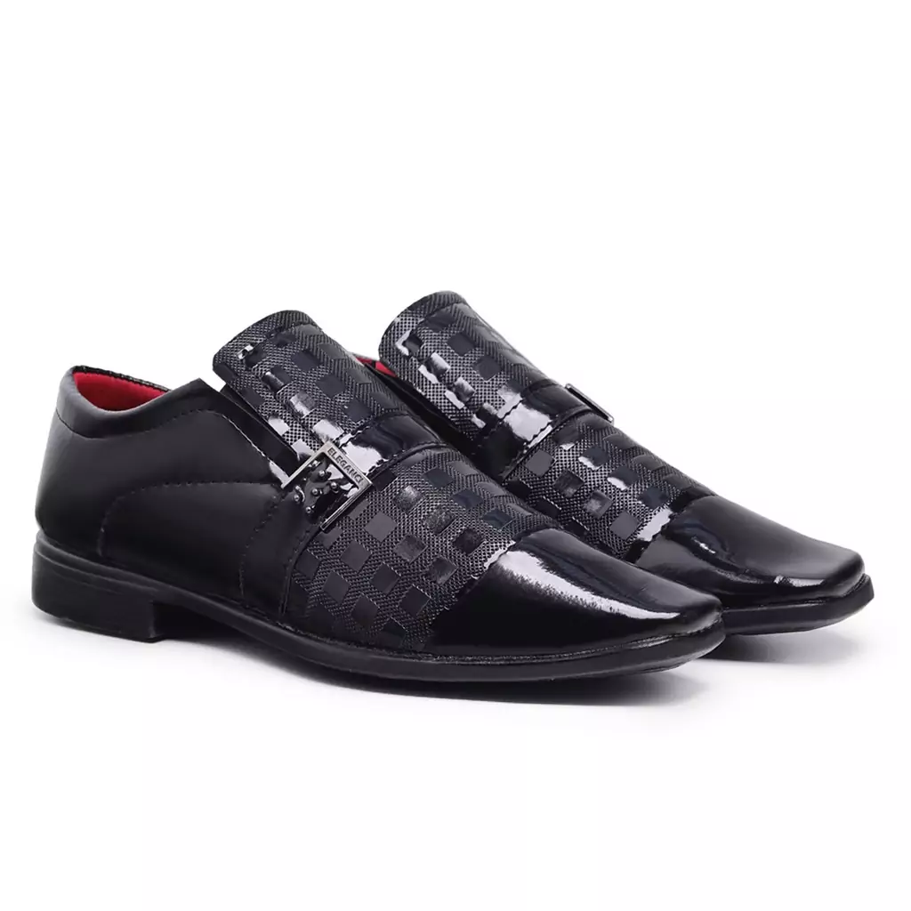 DETALHES DOS PRODUTOS Acompanha: 3 Sapatos Social Confeccionado em Verniz O Sapato Social em Couro Ecológico Verniz Preto e Textura Asti, é confeccionado e estampado com detalhes em verniz. Destaque ao ponto diamante em metal prata promovendo sofisticação e luxo ao modelo. Elásticos nas laterais facilitam o calce. O forro em P.U proporcionam conforto aos pés, enquanto o solado em borracha permite estabilidade e segurança ao caminhar.